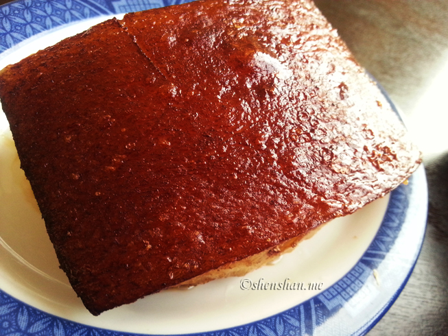 11. 出锅后待咸烧白稍冷(不怕烫的趁热操作)用一个比蒸制容器大的盘子紧扣容器,翻过来就可以上桌了。(通常我先用另一个碗把蒸制时的汤汁倒出来,然后再把肉在sink 上方扣出来,然后把汤汁倒回去,呵呵,怕烫,手脚也没那么利索)
