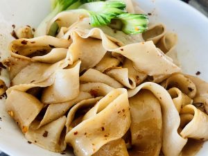 广东人说“鸡有鸡味,饭有饭味”,在陕西,吃面是有品味的事,因为会做面食的人绝对是匠人。会吃面的人,吃的一定是现和的面,面粉和水的比例因为季节、温度、干湿度的不同有所差异,不同的面食对饧面时间的要求也不一样。刚到成都的时候除了挂面,自由市场里也有切面卖,被四川人称作“切面”的是作坊里用机器制作的各类生面,面条的宽窄有三四个选项、摊子上同时还卖当天压制的馄饨皮和饺子皮。和自家和的面相比,切面里面粉和水的比例是固定的,面馆里的清汤杂酱面、素椒杂酱面、海味面、怪味面、肥肠面、素面用的大都是这样的切面,唯夏天的凉面不同,和面的原料里加了碱水,面条更滑,也更筋道;至于被称作甜水面的小吃,对应到陕西的面食中,基本上属于手擀面的行列,只不过切条之前的面皮擀得比较厚,切出来的面条比较粗而已。切面是自己和的面和挂面间折衷的选择,因为有汤头的加持,加上新鲜的面条里自带的水份,煮出来后的口感虽赶不上自己和的面,却远胜于挂面。切面胜在新鲜,却输在没什么延展性,也就是俗话说的抻头儿。自从给家里的厨师机添了面条机的配件后,我就再也不买超市里的馄饨皮,毕竟,无论馄饨皮还是饺子皮,按一定的比例和好的面团哪怕经过面条机,也比超市里卖的有抻头。