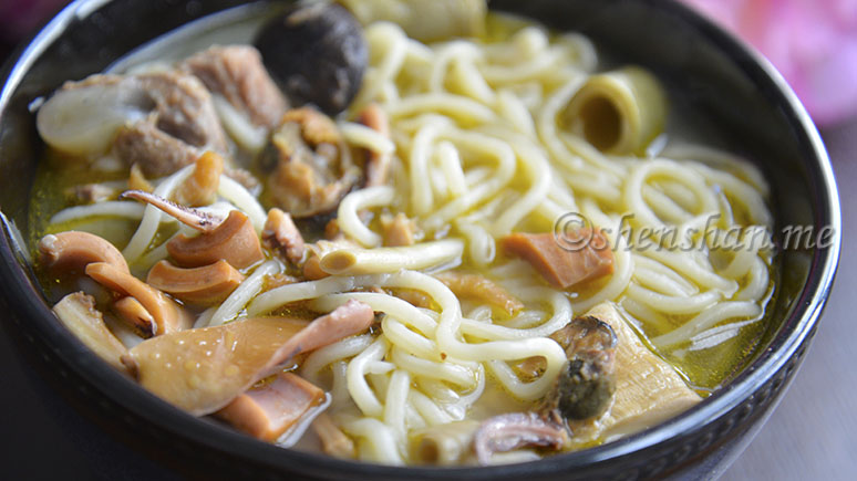 准备起汤的第二天,视淡菜、干贝、虾米(开洋)的干燥度决定泡发时间,韩国店的淡菜不会太干,水里泡两个小时,洗去沙砾就可以准备下锅了。干虾米泡到皮软心硬就好,无骨肉洗净,跑去血水,生姜切好,发好的鱿鱼除去黑膜和骨头,一股脑地下锅大火烧开,打去浮沫,中高火1-1.5小时,汤色奶白时加一大勺白胡椒粉下去煮个十来分钟,海味面的精华就好了。